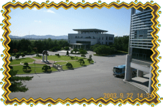ここは韓国と北朝鮮の国境の板門店です。向こうに見えるのが北朝鮮です。